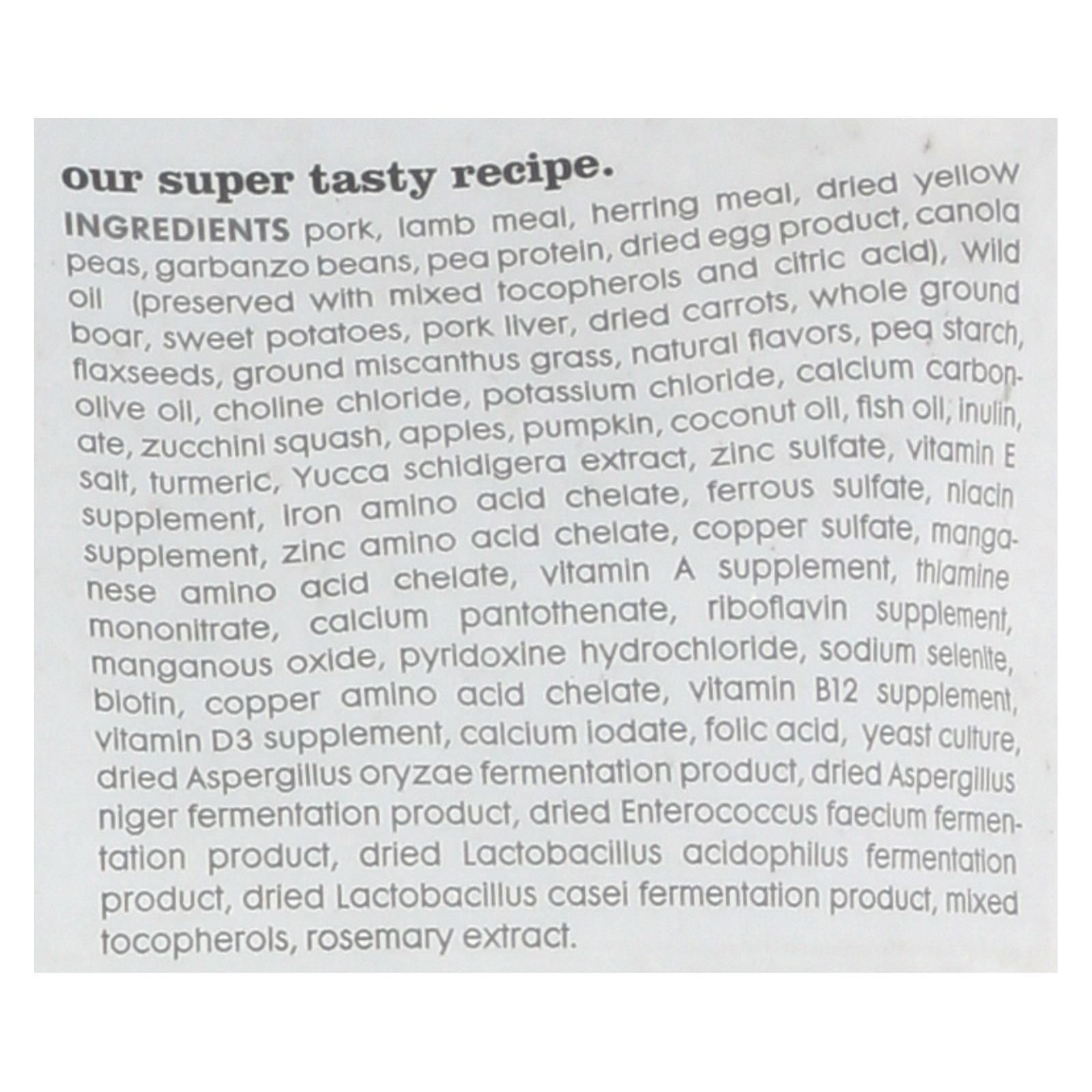 ingredients : pork;beef meal;herring meal;peas;chickpeas;pea protein;dried egg product;canola oil;preserved with mixed tocopherols;pea starch;wild boar;sweet potatoes;pork liver;dried carrots;whole ground flaxseeds;ground miscanthus grass;natural flavors;olive oil;vitamin a supplement;vitamin d3 supplement;vitamin e supplement;niacin supplement;pantothenic acid;pyridoxine hydrochloride;riboflavin supplement;folic acid;biotin;vitamin b12 supplement;choline chloride;potassium chloride;apples;yeast culture;sodiu